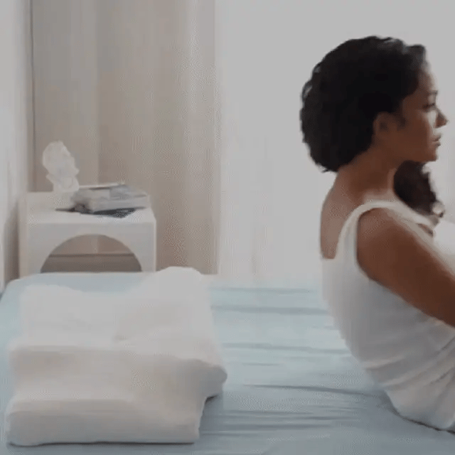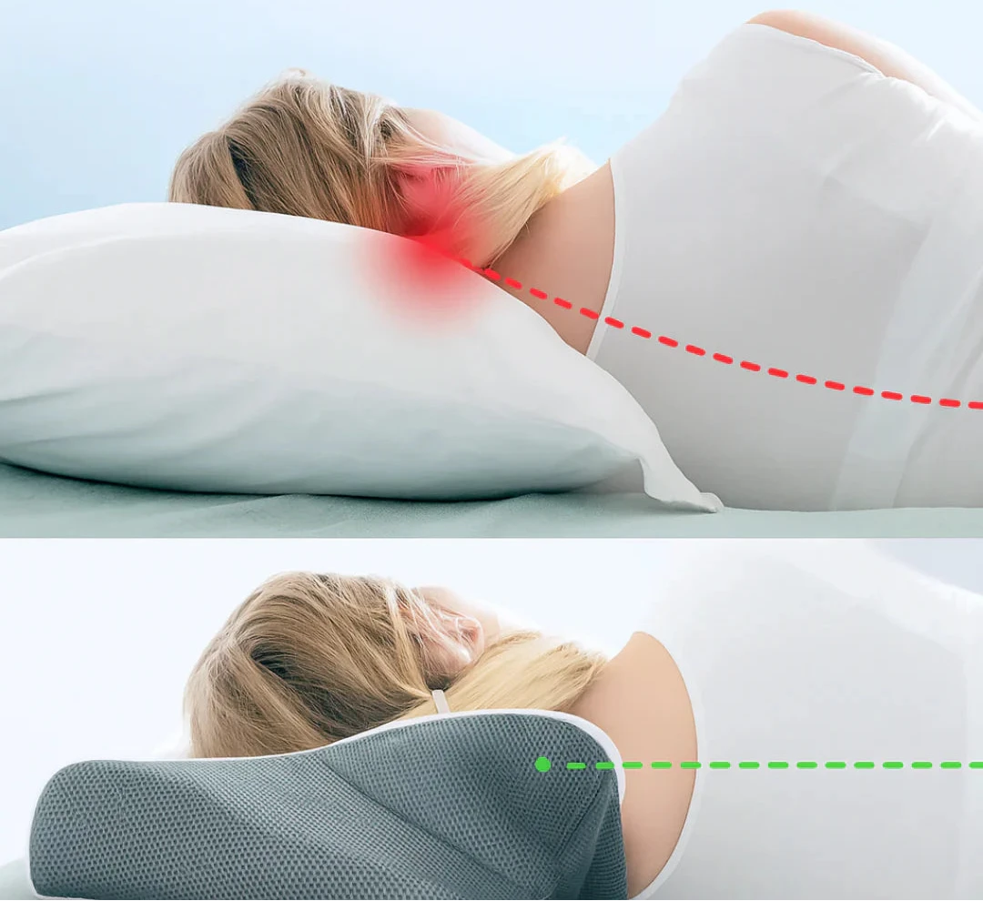 La zone creusée au centre stabilise la tête tandis que les ailes latérales soutiennent les cervicales. Cela réduit la pression sur les trapèzes, améliore l’alignement vertébral et atténue les tensions musculaires pendant la nuit.
