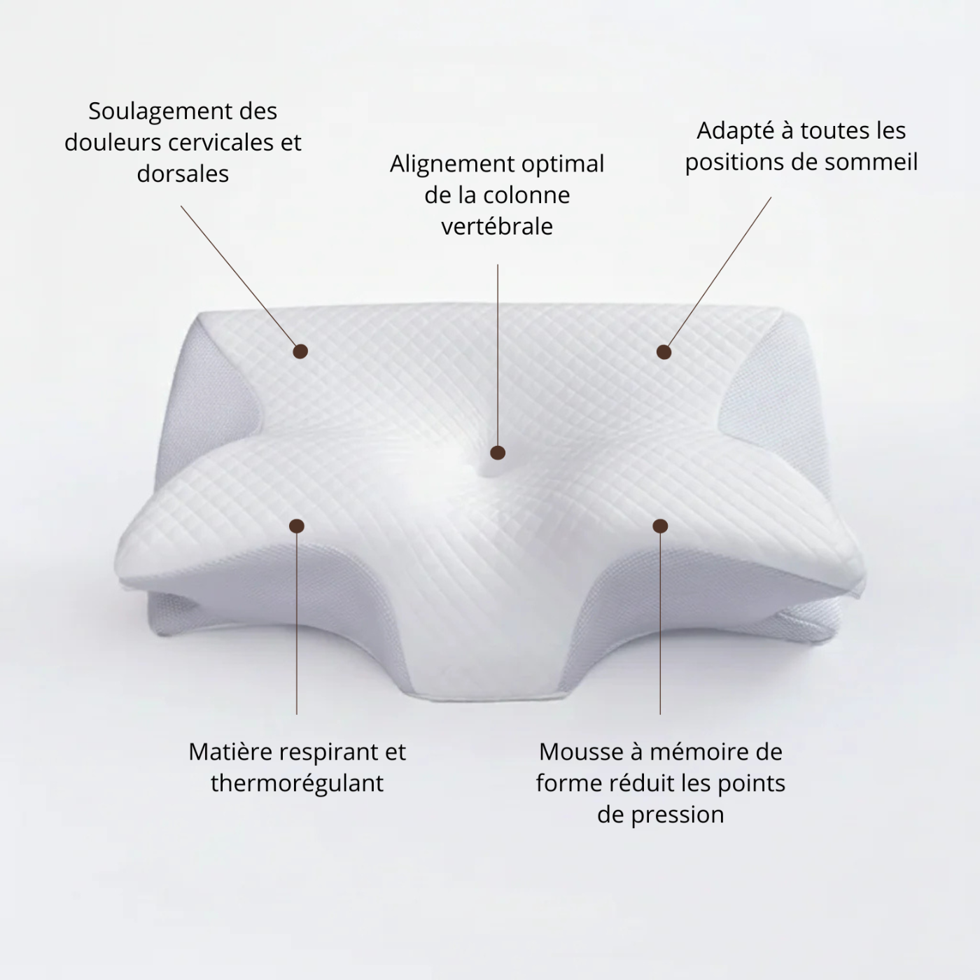 Notre produit est conçu pour épouser naturellement la forme de votre tête et de votre nuque, afin de réduire les tensions et d’améliorer l’alignement cervical.