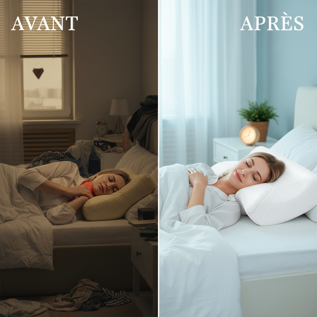 La majorité des utilisateurs rapportent un endormissement plus rapide, moins de micro-réveils liés à l’inconfort et une réduction des tensions au réveil. L’oreiller favorise une position naturelle qui calme le système musculaire.